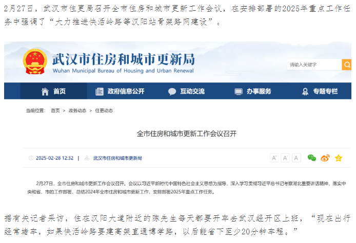 重磅消息!武漢市住房和城市更新局明確大力推進(jìn)快活嶺路等漢陽(yáng)站骨架路網(wǎng)建設(shè)